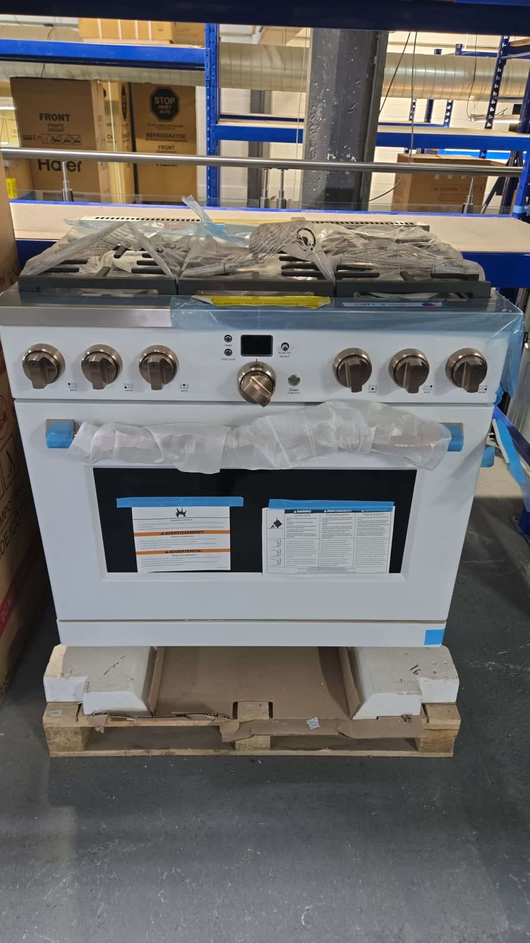 The two convection ovens allow simultaneous multi-temperature cooking, delivering precise and even baking. Its matte white finish with brushed bronze accents gives a luxurious look to any kitchen.