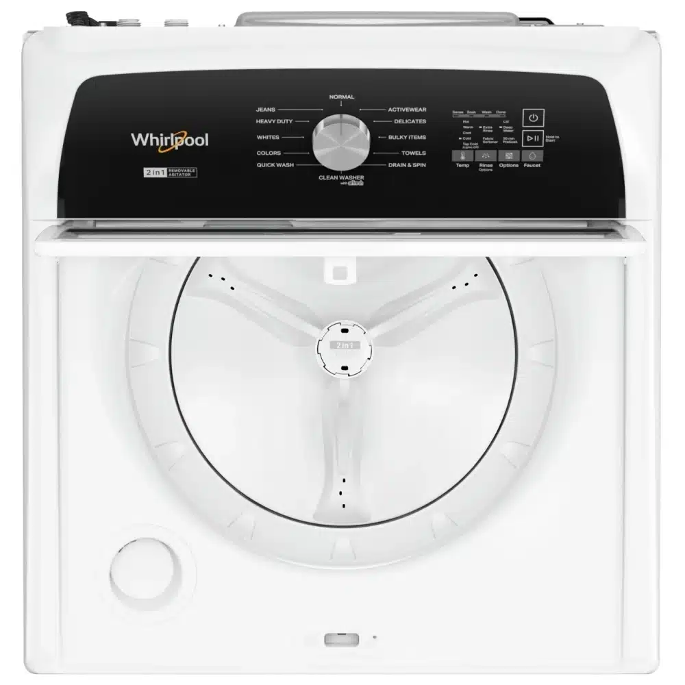 The Whirlpool WTW5057LW and YWED5050LW washer dryer set delivers flexibility and reliability for everyday laundry. The 5.5 cu. ft. top load washer features a 2-in-1 removable agitator, giving you the option to wash with or without an agitator. It includes 12 wash cycles, 5 temperature settings, a 770 RPM spin speed, and a built-in water faucet for pre-treating stains. The 7.0 cu. ft. electric dryer offers 12 dry cycles, 4 temperature settings, and a durable steel drum for long-lasting performance.